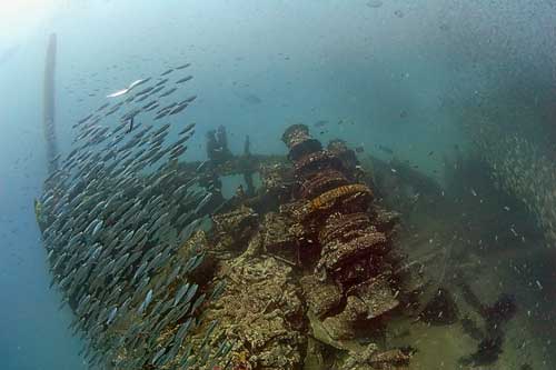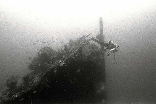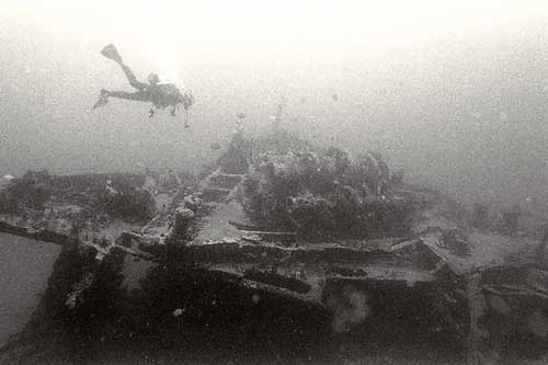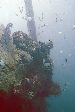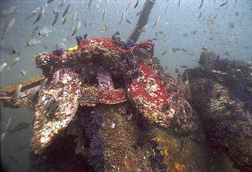 Description: Because it is relatively small and the wreckage is contiguous from bow-to-stern, the Caribsea is an easy wreck to navigate on-- even in the worst visibility! The boilers, engine and bow are the highest and most notable sites on the wreck. This wreck is one of the best for marine life. It is often covered up with bait which attracts sharks, amberjacks and other large predators. Visit the bow while you still can, because it won't remain standing for long. The beams supporting the upper deck have given way and the deck, with its heavy anchor windlass, has been dropping and twisting to star board ever since 1993. The storms of late 1994 caused more significant damage. The upper decking is now almost completely gone. The windlass has twisted and dropped even further and has dragged the port anchor on to what used to be the upper deck. Much of the fish concentration and feeding dynamics occur above the high point of the bow. Just hanging above the bow for the entire dive can prove entertaining as your are engulfed in schools of bait, groups of sandtigers sharks and marrauding bands of amberjacks. In the fall, the viz can often be reduced to less than one foot by the dense schools of bait. Update 2006: The Caribsea is getting more and more fragile particularly in the bow section. The weight of the windlass has collapsed the decks and all the surface metal is thin and rotten. The two anchors, once sitting proudly in the hawse pipes are now gone. The starbard anchor has fallen to the sand and the port anchor has been covered in the collapsing debris. Even the anchor windlass has started to collapse. The engine and boilers remain as solid as ever and fish life still abounds, with groups of sentinel sandtigers sharks sitting above the bow and stern. |
