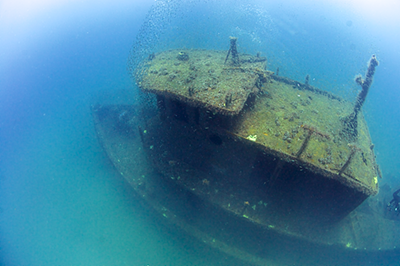 | Description: The Titan is relatively shallow, small and intact making it an very easy dive to navigate and completely investigate within a single dive. There are several great photo sites, particularly up near the bow and pilot houses, especially if the baitfish are swirling. The viz tends to be better the high up on the wreck you go. |
